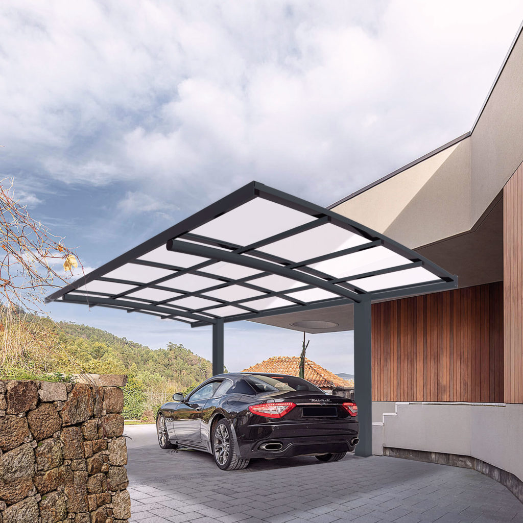Ein Blickfang in jeder Einfahrt, mit Schutz für Ihr Auto oder Motorrad vor Witterungseinflüssen wie Regen oder Hagel sowie Sonneneinstrahlung. Das bietet unser Aluminium Carport Deluxe.