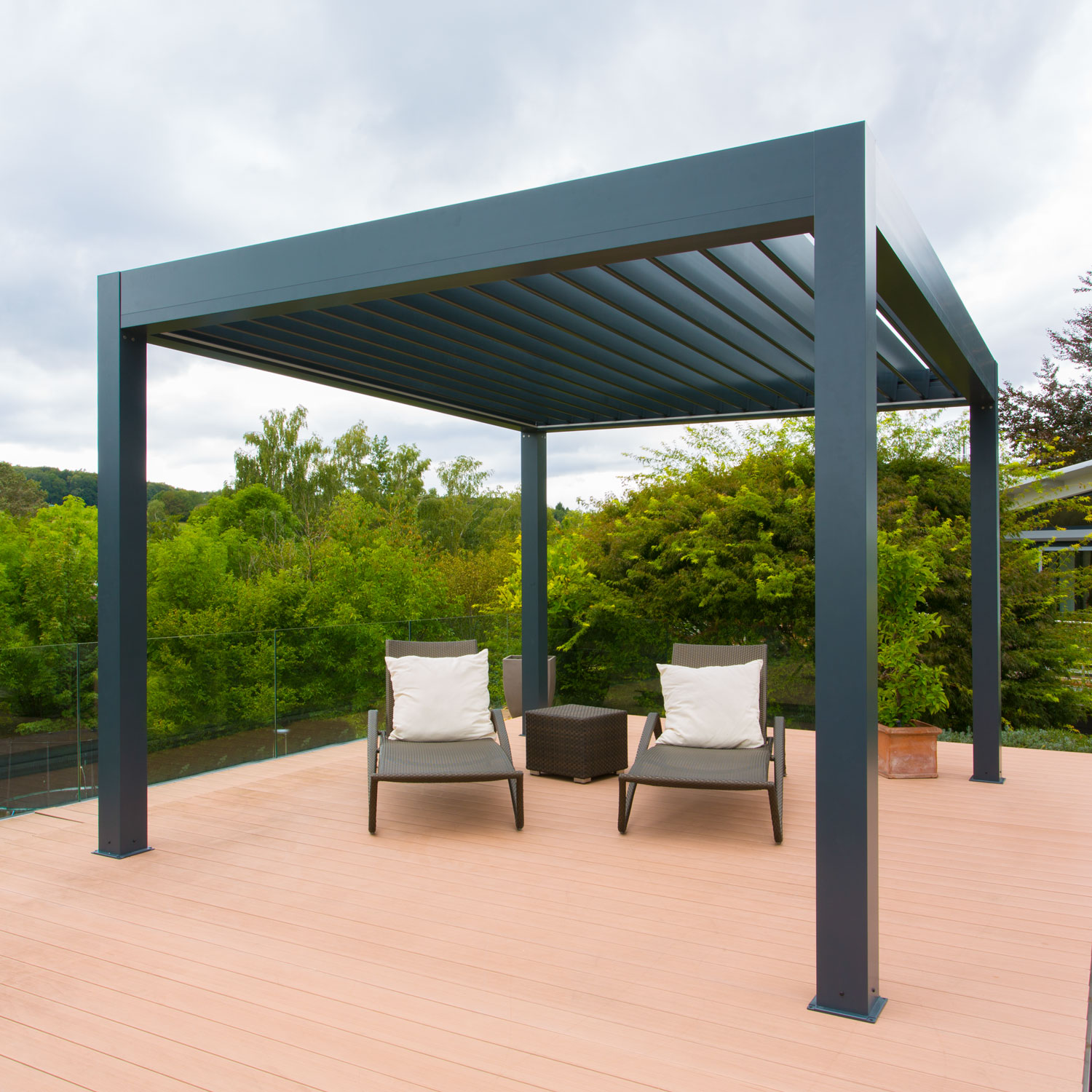 Unser Pavillon REMA mit schwenkbaren Aluminium-Lamellen bietet den perfekten Sonnen- und Regenschutz in einem System. Durch die automatisierten Lamellen mit einer Stärke von 40 mm sind Sie vor Sonneneinstrahlungen und Regeneinflüssen perfekt geschützt. Über die seitlichen pulverbeschichteten Aluminium-Pfosten (15 x 15 cm) und der integrierten Regenrinne ist ein sicherer Wasserablauf gewährleistet.